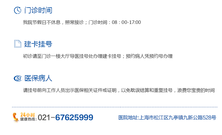 温馨提示:预约成功后,预约挂号中心会以电话或者短信的方式通知预约号,如有疑问请拨打021-67625959客服。