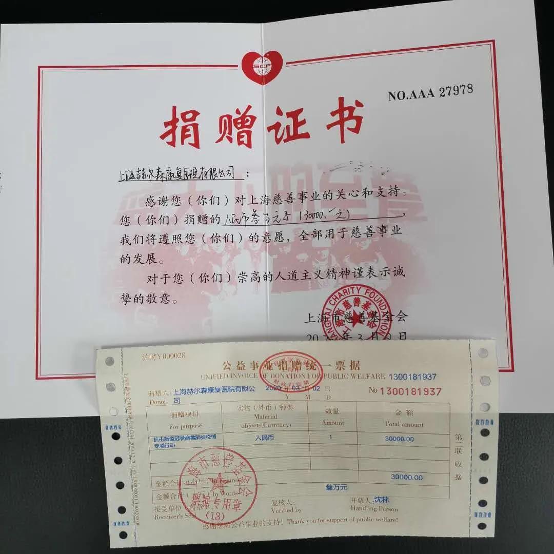病毒无情,人间有爱。新型冠状病毒感染肺炎爆发以来,上海赫尔森康复医院时刻关注疫情发展,勇于承担社会责任,积极响应上海市慈善基金会“抗击新型冠状病毒肺炎疫情专项募捐行动”,向上海市慈善基金会松江区分会九亭镇工作站捐赠善款30000元,用实际行动为疫情防控工作增添正能量,全力以赴参与疫情防控阻击战。