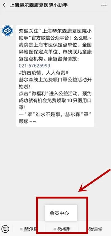 在上海赫尔森康复医院小助手微信对话框菜单栏找到【微福利】,点击【会员中心】注册登录后进入预约通道;