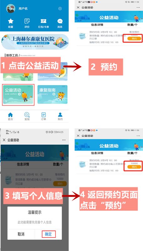 进入活动页面,点击【公益活动】模块,进入口罩预约页面,点击预约、完善个人信息并提交确定,自动跳转预约页面进入预约流程,点击“立即预约”即可。预约详情可在首页【订单】栏查询,预约成功用户可获取快递单号,通过快递官网可查询物流状态。